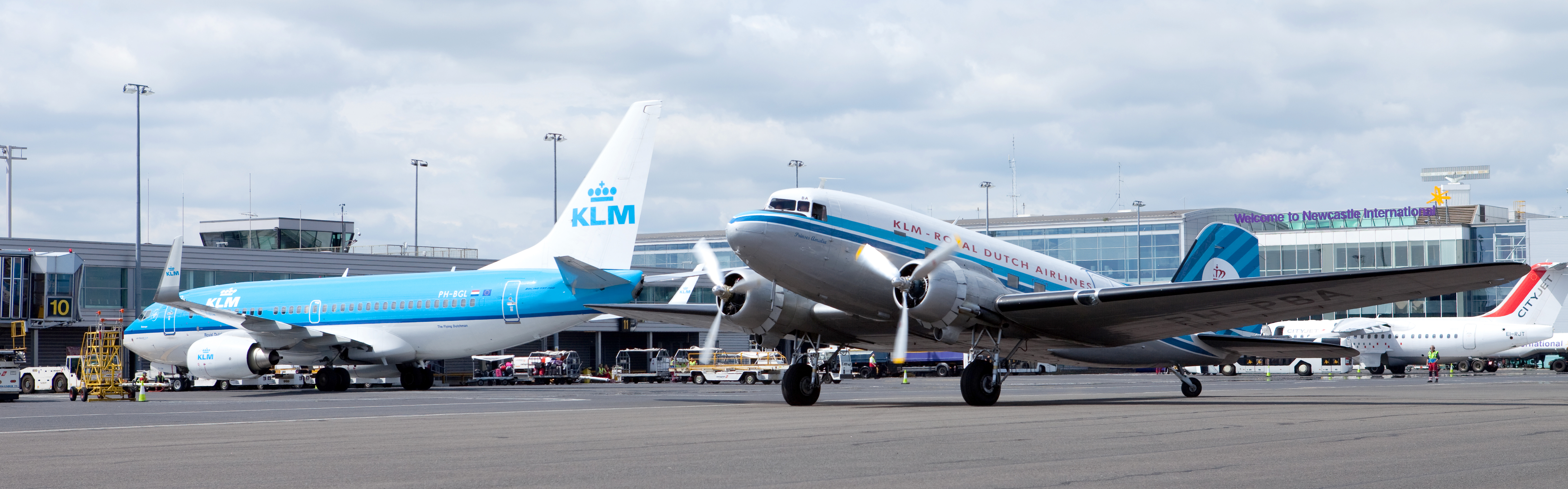 Professional commercial photography shot showing two KLM planes at an airport. Shot by professional northeast commercial photographer Cal Carey.